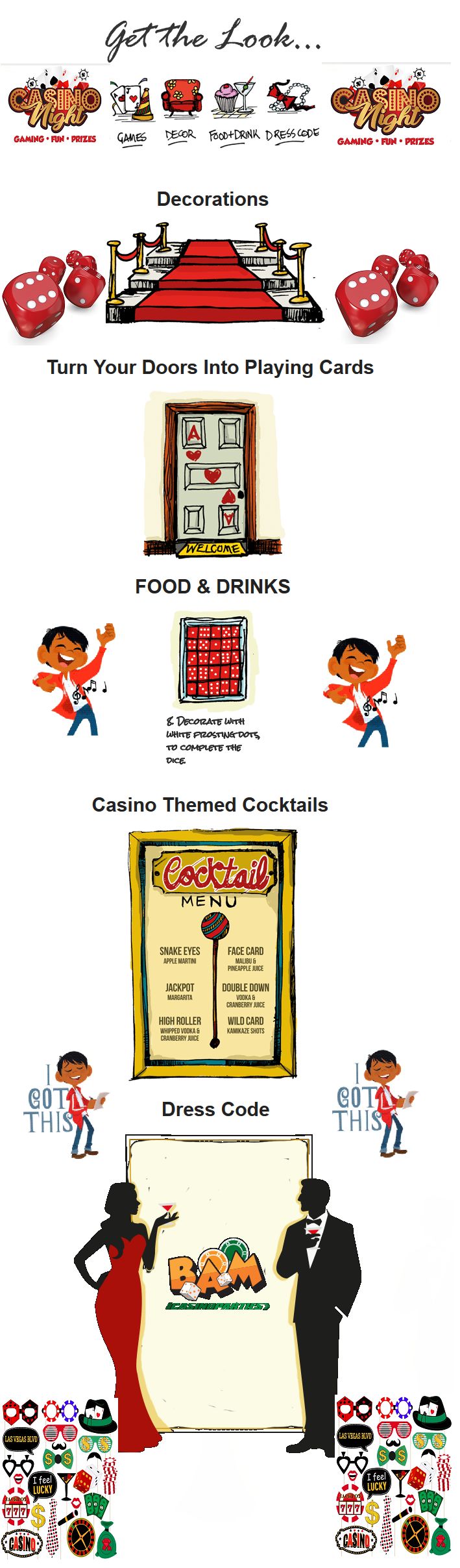 We at BAM casino parties offer you hundreds of casino party ideas. You can have different ideas as per your choices whether it’s an indoor or an outdoor space, there is everything for your needs with us. Lots and lots of suggestions are waiting to get your guests in the mood with the perfect entertainment built just for your event.