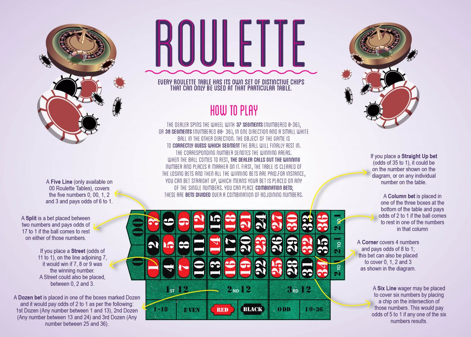 - Straight Up Bet: A wager on a single number and it pays 35 to 1.